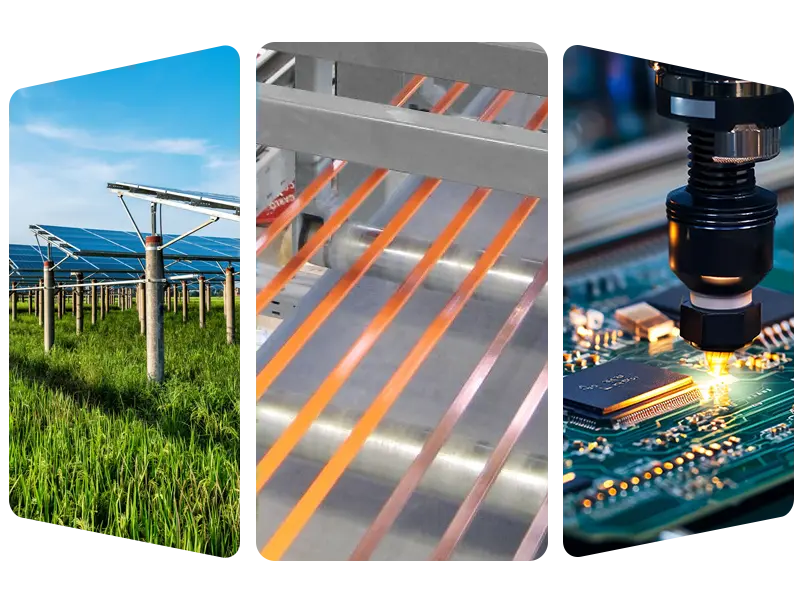 • Fotovoltaïese veld: massaproduksie van fotovoltaïese sweislinte en rails om komponente te help om elektrisiteit doeltreffend te gelei.